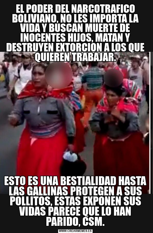 EL PODER DEL NARCOTRAFICO BOLIVIANO, NO LES IMPORTA LA VIDA Y BUSCAN MUERTE DE INOCENTES HIJOS, MATAN Y DESTRUYEN EXTORCION A LOS QUE QUIEREN TRABAJAR. ESTO ES UNA BESTIALIDAD HASTA LAS GALLINAS PROTEGEN A SUS POLLITOS, ESTAS EXPONEN SUS VIDAS PARECE QUE LO HAN PARIDO, CSM.