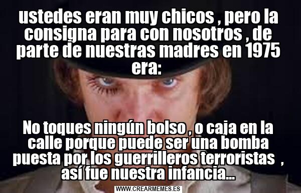 ustedes eran muy chicos , pero la consigna para con nosotros , de parte de nuestras madres en 1975 era: No toques ningún bolso , o caja en la calle porque puede ser una bomba puesta por los guerrilleros terroristas , así fue nuestra infancia...