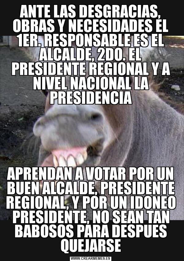 ANTE LAS DESGRACIAS, OBRAS Y NECESIDADES EL 1ER. RESPONSABLE ES EL ALCALDE, 2DO. EL PRESIDENTE REGIONAL Y A NIVEL NACIONAL LA PRESIDENCIA APRENDAN A VOTAR POR UN BUEN ALCALDE, PRESIDENTE REGIONAL, Y POR UN IDONEO PRESIDENTE, NO SEAN TAN BABOSOS PARA DESPUES QUEJARSE