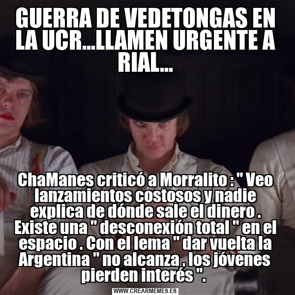 GUERRA DE VEDETONGAS EN LA UCR...LLAMEN URGENTE A RIAL... ChaManes criticó a Morralito : " Veo lanzamientos costosos y nadie explica de dónde sale el dinero . Existe una " desconexión total " en el espacio . Con el lema " dar vuelta la Argentina " no alcanza , los jóvenes pierden in