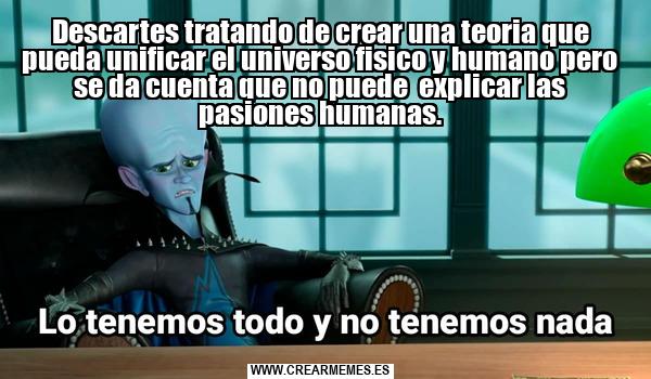Descartes tratando de crear una teoria que pueda unificar el universo fisico y humano pero se da cuenta que no puede explicar las pasiones humanas.