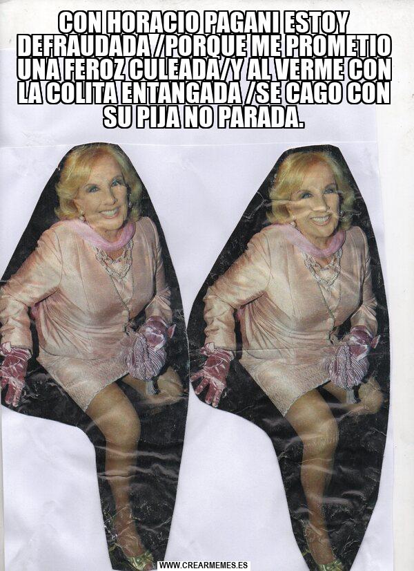 CON HORACIO PAGANI ESTOY DEFRAUDADA /PORQUE ME PROMETIO UNA FEROZ CULEADA/Y AL VERME CON LA COLITA ENTANGADA /SE CAGO CON SU PIJA NO PARADA.