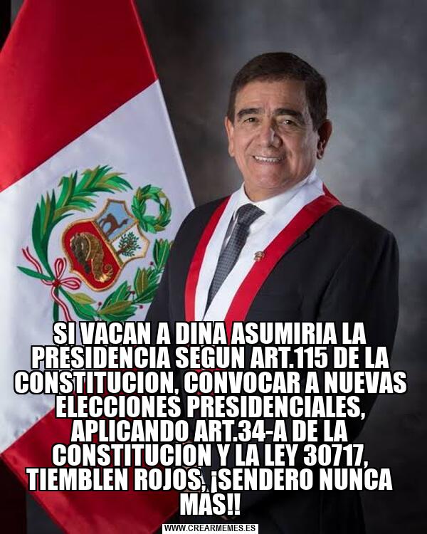 SI VACAN A DINA ASUMIRIA LA PRESIDENCIA SEGUN ART.115 DE LA CONSTITUCION, CONVOCAR A NUEVAS ELECCIONES PRESIDENCIALES, APLICANDO ART.34-A DE LA CONSTITUCION Y LA LEY 30717, TIEMBLEN ROJOS, ¡SENDERO NUNCA MAS!!