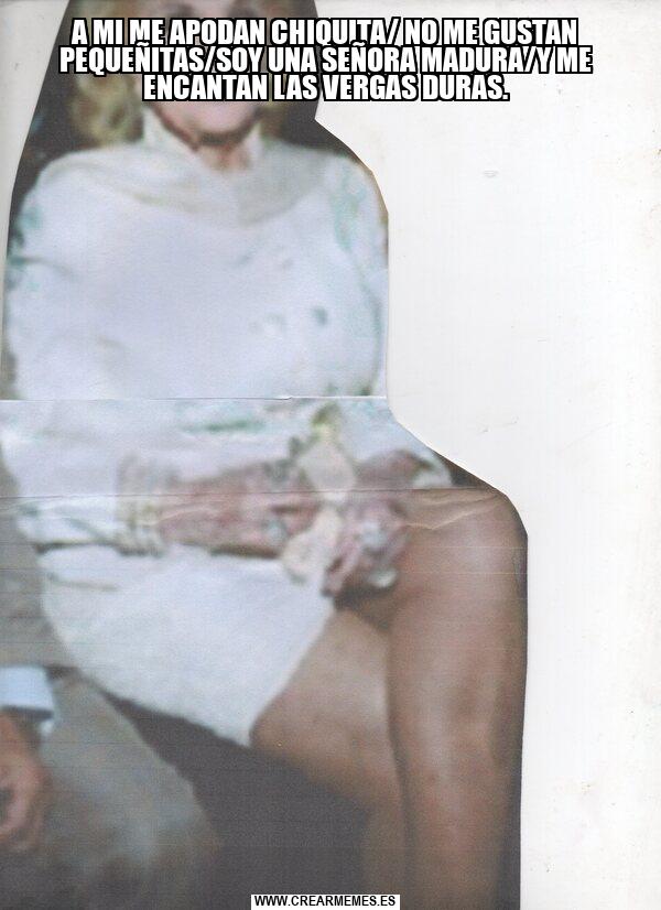 A MI ME APODAN CHIQUITA/ NO ME GUSTAN PEQUEÑITAS/SOY UNA SEÑORA MADURA/Y ME ENCANTAN LAS VERGAS DURAS.