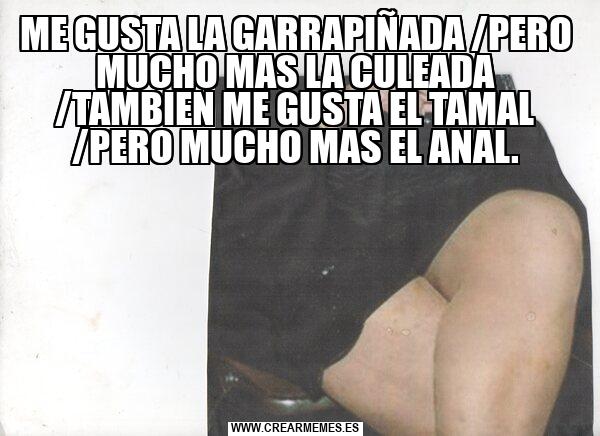 ME GUSTA LA GARRAPIÑADA /PERO MUCHO MAS LA CULEADA /TAMBIEN ME GUSTA EL TAMAL /PERO MUCHO MAS EL ANAL.
