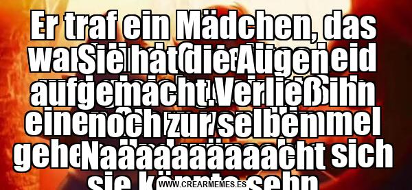 Er traf ein Mädchen, das war blind. Geteiltes Leid und gleichgesinnt.Sah einen Stern vom Himmel gehen. Und wünschte sich sie könnte sehn Sie hat die Augen aufgemacht.Verließ ihn noch zur selben Naaaaaaaaaacht