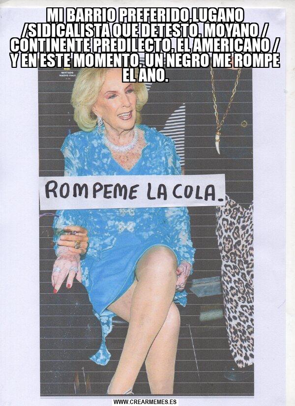 MI BARRIO PREFERIDO,LUGANO /SIDICALISTA QUE DETESTO, MOYANO / CONTINENTE PREDILECTO, EL AMERICANO / Y EN ESTE MOMENTO, UN NEGRO ME ROMPE EL ANO.