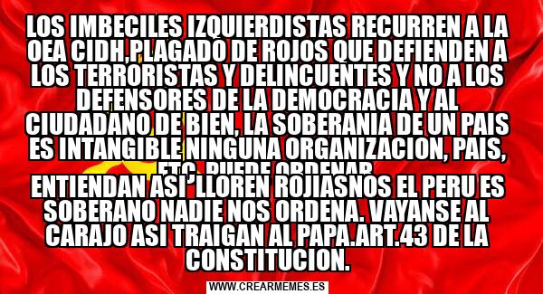 LOS IMBECILES IZQUIERDISTAS RECURREN A LA OEA CIDH,PLAGADO DE ROJOS QUE DEFIENDEN A LOS TERRORISTAS Y DELINCUENTES Y NO A LOS DEFENSORES DE LA DEMOCRACIA Y AL CIUDADANO DE BIEN, LA SOBERANIA DE UN PAIS ES INTANGIBLE NINGUNA ORGANIZACION, PAIS, ETC, P ENTIENDAN ASI LLOREN ROJIASNOS EL PERU ES SOBERANO NADIE NOS ORDENA. VAYANSE AL CARAJO ASI TRAIGAN AL PAPA.ART.43 DE LA CONSTITUCION.