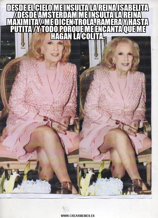 DESDE EL CIELO ME INSULTA LA REINA ISABELITA /DESDE AMSTERDAM ME INSULTA LA REINA MAXIMITA / ME DICEN TROLA, RAMERA Y HASTA PUTITA /Y TODO PORQUE ME ENCANTA QUE ME HAGAN LA COLITA.