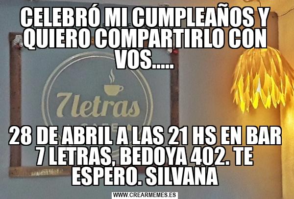 CELEBRÓ MI CUMPLEAÑOS Y QUIERO COMPARTIRLO CON VOS..... 28 DE ABRIL A LAS 21 HS EN BAR 7 LETRAS, BEDOYA 402. TE ESPERO. SILVANA