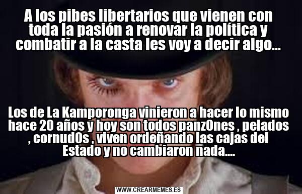 A los pibes libertarios que vienen con toda la pasión a renovar la política y combatir a la casta les voy a decir algo... Los de La Kamporonga vinieron a hacer lo mismo hace 20 años y hoy son todos panz0nes , pelados , cornud0s , viven ordeñando las cajas del Estado y no cambiaron nada....