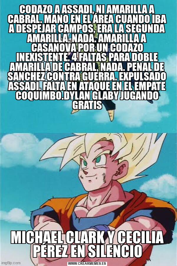 CODAZO A ASSADI, NI AMARILLA A CABRAL. MANO EN EL ÁREA CUANDO IBA A DESPEJAR CAMPOS, ERA LA SEGUNDA AMARILLA, NADA. AMARILLA A CASANOVA POR UN CODAZO INEXISTENTE. 4 FALTAS PARA DOBLE AMARILLA DE CABRAL, NADA. PENAL DE SANCHEZ CONTRA GUERRA. EXPULSADO MICHAEL CLARK Y CECILIA PÉREZ EN SILENCIO