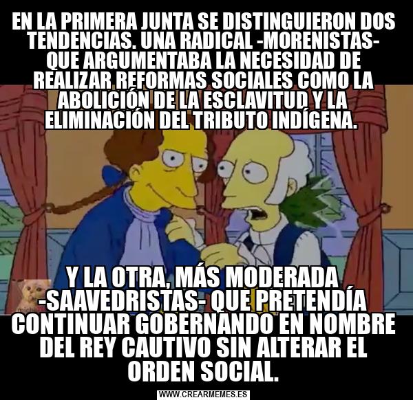 EN LA PRIMERA JUNTA SE DISTINGUIERON DOS TENDENCIAS. UNA RADICAL -MORENISTAS- QUE ARGUMENTABA LA NECESIDAD DE REALIZAR REFORMAS SOCIALES COMO LA ABOLICIÓN DE LA ESCLAVITUD Y LA ELIMINACIÓN DEL TRIBUTO INDÍGENA. Y LA OTRA, MÁS MODERADA -SAAVEDRISTAS- QUE PRETENDÍA CONTINUAR GOBERNANDO EN NOMBRE DEL REY CAUTIVO SIN ALTERAR EL ORDEN SOCIAL.