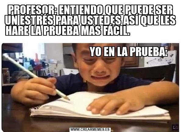 PROFESOR: ENTIENDO QUE PUEDE SER UN ESTRÉS PARA USTEDES ASÍ QUE LES HARE LA PRUEBA MAS FÁCIL. YO EN LA PRUEBA: