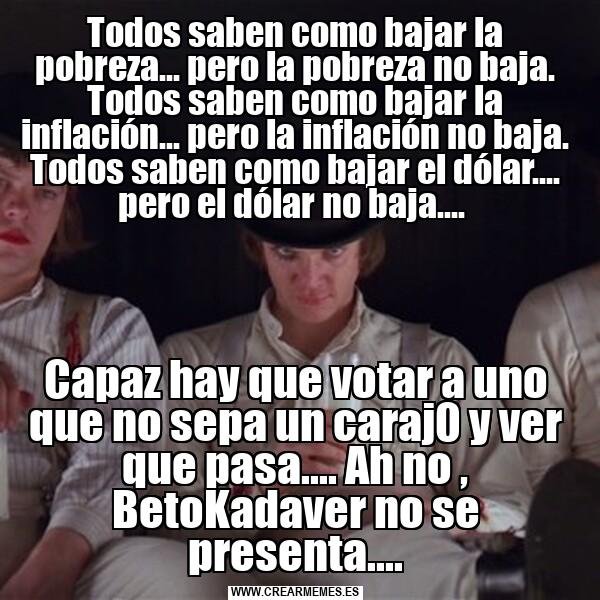 Todos saben como bajar la pobreza... pero la pobreza no baja. Todos saben como bajar la inflación... pero la inflación no baja. Todos saben como bajar el dólar.... pero el dólar no baja.... Capaz hay que votar a uno que no sepa un caraj0 y ver que pasa.... Ah no , BetoKadaver no se presenta....