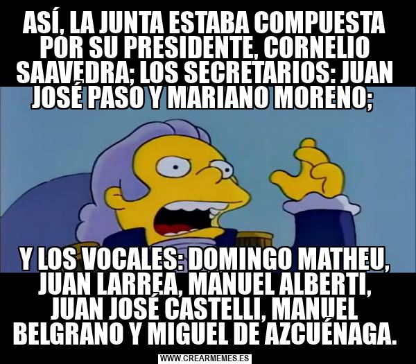 ASÍ, LA JUNTA ESTABA COMPUESTA POR SU PRESIDENTE, CORNELIO SAAVEDRA; LOS SECRETARIOS: JUAN JOSÉ PASO Y MARIANO MORENO; Y LOS VOCALES: DOMINGO MATHEU, JUAN LARREA, MANUEL ALBERTI, JUAN JOSÉ CASTELLI, MANUEL BELGRANO Y MIGUEL DE AZCUÉNAGA.