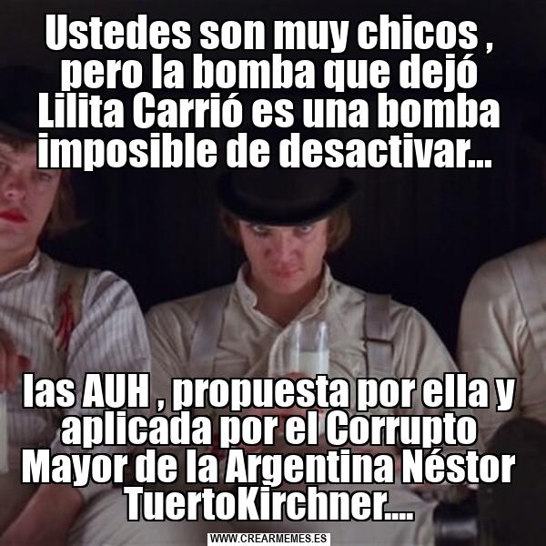 Ustedes son muy chicos , pero la bomba que dejó Lilita Carrió es una bomba imposible de desactivar... las AUH , propuesta por ella y aplicada por el Corrupto Mayor de la Argentina Néstor TuertoKirchner....