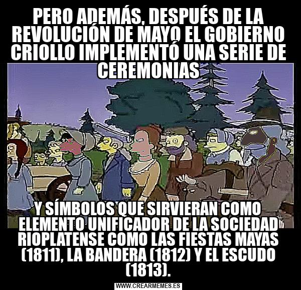 PERO ADEMÁS, DESPUÉS DE LA REVOLUCIÓN DE MAYO EL GOBIERNO CRIOLLO IMPLEMENTÓ UNA SERIE DE CEREMONIAS Y SÍMBOLOS QUE SIRVIERAN COMO ELEMENTO UNIFICADOR DE LA SOCIEDAD RIOPLATENSE COMO LAS FIESTAS MAYAS (1811), LA BANDERA (1812) Y EL ESCUDO (1813).