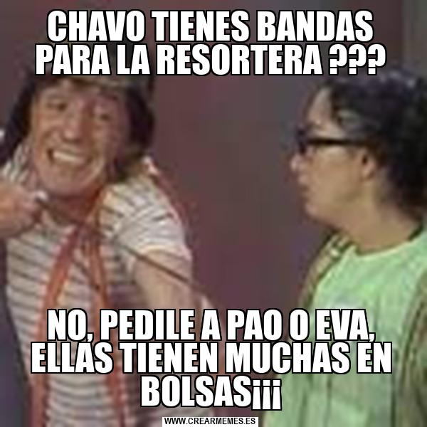 CHAVO TIENES BANDAS PARA LA RESORTERA ??? NO, PEDILE A PAO O EVA, ELLAS TIENEN MUCHAS EN BOLSAS¡¡¡