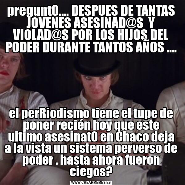 pregunt0.... DESPUES DE TANTAS JOVENES ASESINAD@S Y VIOLAD@S POR LOS HIJOS DEL PODER DURANTE TANTOS AÑOS .... el perRiodismo tiene el tupe de poner recién hoy que este ultimo asesinat0 en Chaco deja a la vista un sistema perverso de poder . hasta ahora fueron ciegos?