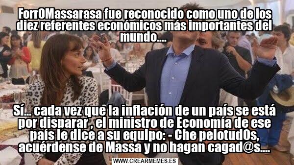 Forr0Massarasa fue reconocido como uno de los diez referentes económicos más importantes del mundo.... Sí... cada vez que la inflación de un país se está por disparar , el ministro de Economía de ese país le dice a su equipo: - Che pelotud0s, acuérdense de Massa y no hagan cagad@s....