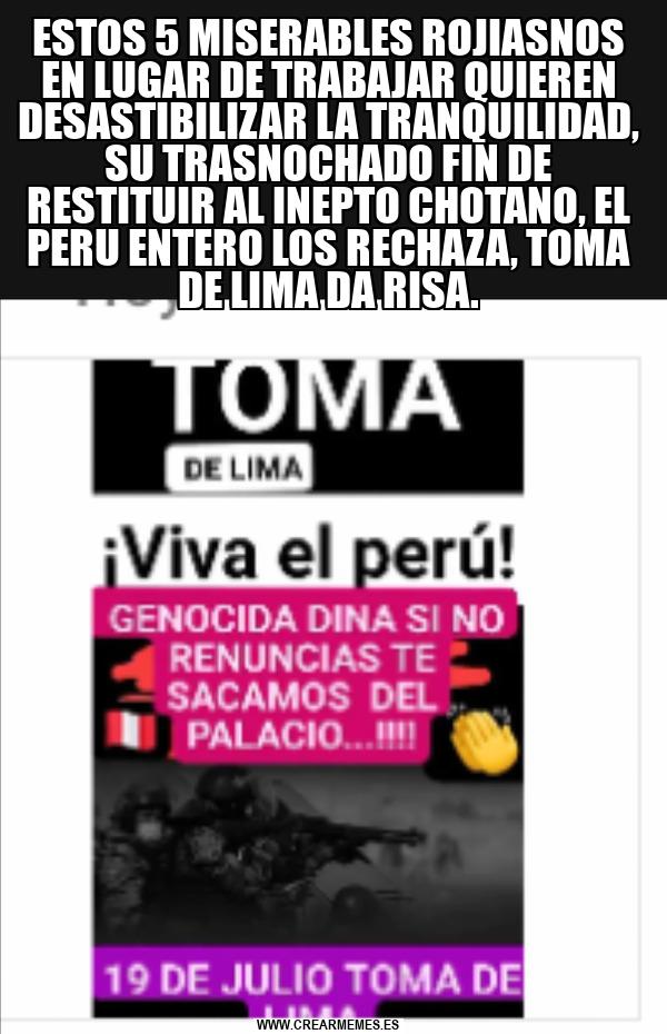 ESTOS 5 MISERABLES ROJIASNOS EN LUGAR DE TRABAJAR QUIEREN DESASTIBILIZAR LA TRANQUILIDAD, SU TRASNOCHADO FIN DE RESTITUIR AL INEPTO CHOTANO, EL PERU ENTERO LOS RECHAZA, TOMA DE LIMA DA RISA.