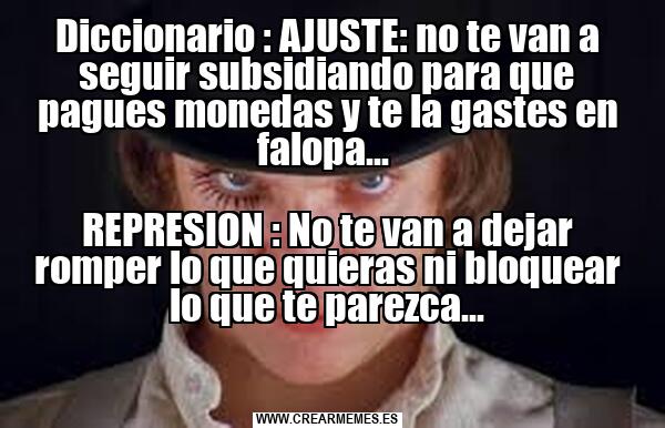Diccionario : AJUSTE: no te van a seguir subsidiando para que pagues monedas y te la gastes en falopa... REPRESION : No te van a dejar romper lo que quieras ni bloquear lo que te parezca...