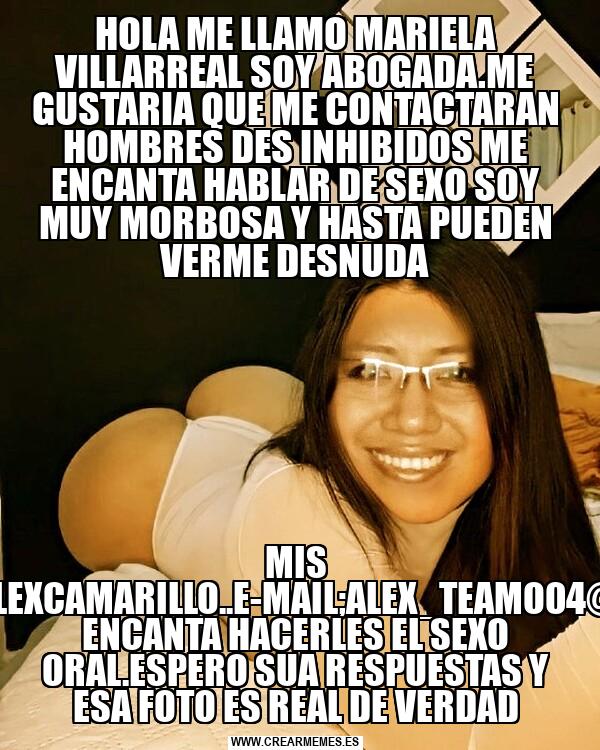 HOLA ME LLAMO MARIELA VILLARREAL SOY ABOGADA.ME GUSTARIA QUE ME CONTACTARAN HOMBRES DES INHIBIDOS ME ENCANTA HABLAR DE SEXO SOY MUY MORBOSA Y HASTA PUEDEN VERME DESNUDA MIS REDES:FACEBOOK:ALEXCAMARILLO..E-MAIL;[email protected] ENCANTA HACERLES EL SEXO ORAL.ESPERO SUA RESPUESTAS Y ESA FOTO ES REAL DE VERDAD
