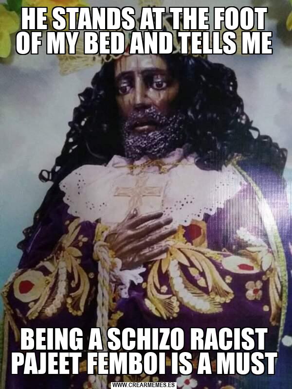 HE STANDS AT THE FOOT OF MY BED AND TELLS ME BEING A SCHIZO RACIST PAJEET FEMBOI IS A MUST