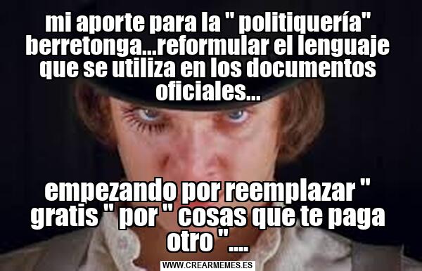 mi aporte para la " politiquería" berretonga...reformular el lenguaje que se utiliza en los documentos oficiales... empezando por reemplazar " gratis " por " cosas que te paga otro "....