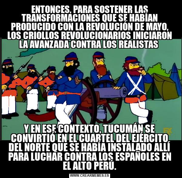 ENTONCES, PARA SOSTENER LAS TRANSFORMACIONES QUE SE HABÍAN PRODUCIDO CON LA REVOLUCIÓN DE MAYO, LOS CRIOLLOS REVOLUCIONARIOS INICIARON LA AVANZADA CONTRA LOS REALISTAS Y EN ESE CONTEXTO, TUCUMÁN SE CONVIRTIÓ EN EL CUARTEL DEL EJÉRCITO DEL NORTE QUE SE HABÍA INSTALADO ALLÍ PARA LUCHAR CONTRA LOS ESPAÑOLES EN EL ALTO PERÚ.