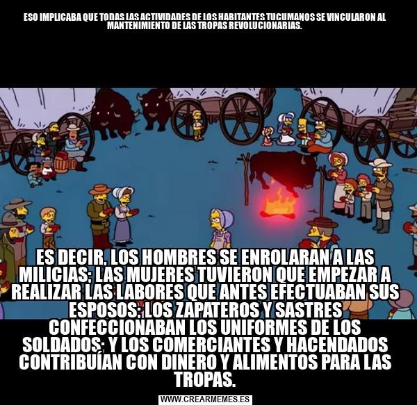ESO IMPLICABA QUE TODAS LAS ACTIVIDADES DE LOS HABITANTES TUCUMANOS SE VINCULARON AL MANTENIMIENTO DE LAS TROPAS REVOLUCIONARIAS. ES DECIR, LOS HOMBRES SE ENROLARAN A LAS MILICIAS; LAS MUJERES TUVIERON QUE EMPEZAR A REALIZAR LAS LABORES QUE ANTES EFECTUABAN SUS ESPOSOS; LOS ZAPATEROS Y SASTRES CONFECCIONABAN LOS UNIFORMES DE LOS SOLDADOS; Y LOS COMERCIANTES Y HACENDADOS CONTRIB