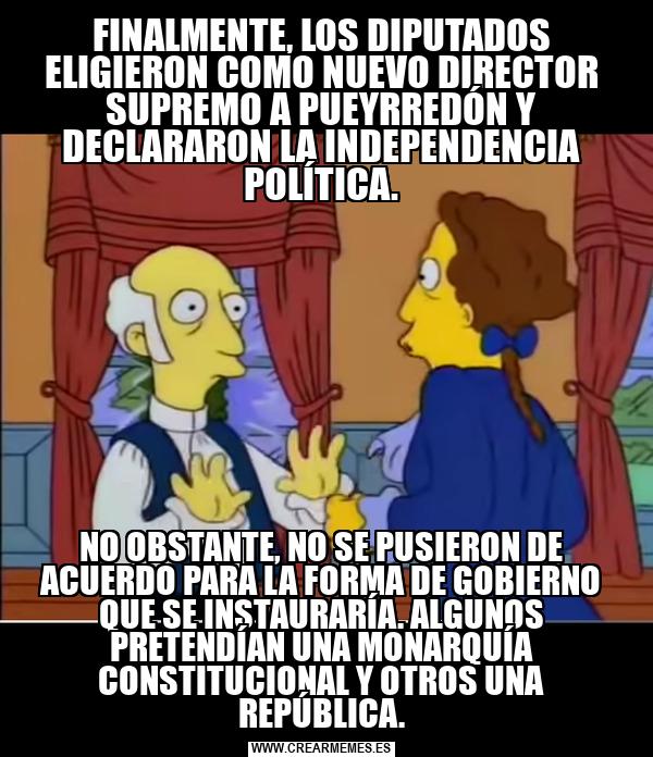 FINALMENTE, LOS DIPUTADOS ELIGIERON COMO NUEVO DIRECTOR SUPREMO A PUEYRREDÓN Y DECLARARON LA INDEPENDENCIA POLÍTICA. NO OBSTANTE, NO SE PUSIERON DE ACUERDO PARA LA FORMA DE GOBIERNO QUE SE INSTAURARÍA. ALGUNOS PRETENDÍAN UNA MONARQUÍA CONSTITUCIONAL Y OTROS UNA REPÚBLICA.