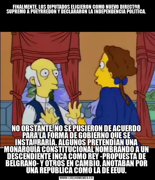 FINALMENTE, LOS DIPUTADOS ELIGIERON COMO NUEVO DIRECTOR SUPREMO A PUEYRREDÓN Y DECLARARON LA INDEPENDENCIA POLÍTICA. NO OBSTANTE, NO SE PUSIERON DE ACUERDO PARA LA FORMA DE GOBIERNO QUE SE INSTAURARÍA. ALGUNOS PRETENDÍAN UNA MONARQUÍA CONSTITUCIONAL NOMBRANDO A UN DESCENDIENTE INCA COMO REY -PROPUESTA DE BELGRANO- Y OTROS EN CAMBIO, ANOTABAN POR UNA REPÚBLICA COMO