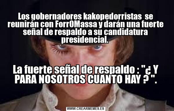 Los gobernadores kakopedorristas se reunirán con Forr0Massa y darán una fuerte señal de respaldo a su candidatura presidencial. La fuerte señal de respaldo : "¿ Y PARA NOSOTROS CUANTO HAY ? ".