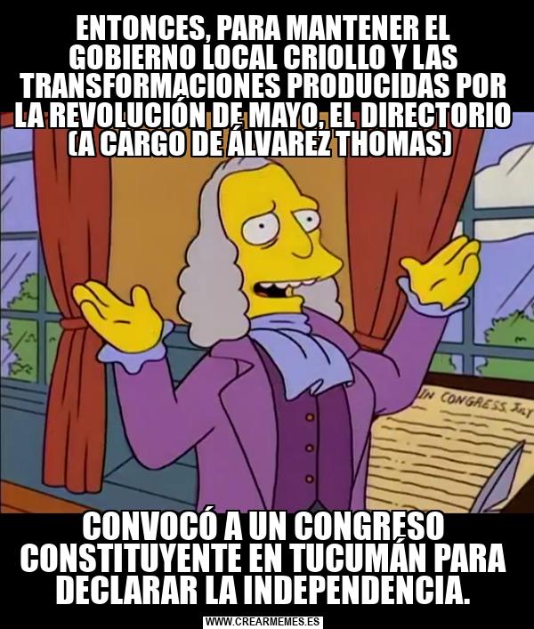 ENTONCES, PARA MANTENER EL GOBIERNO LOCAL CRIOLLO Y LAS TRANSFORMACIONES PRODUCIDAS POR LA REVOLUCIÓN DE MAYO, EL DIRECTORIO (A CARGO DE ÁLVAREZ THOMAS) CONVOCÓ A UN CONGRESO CONSTITUYENTE EN TUCUMÁN PARA DECLARAR LA INDEPENDENCIA.