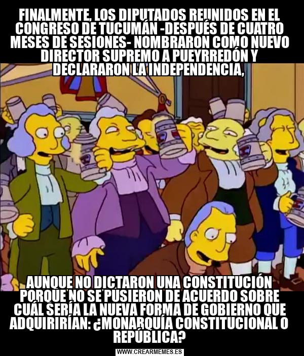 FINALMENTE, LOS DIPUTADOS REUNIDOS EN EL CONGRESO DE TUCUMÁN -DESPUÉS DE CUATRO MESES DE SESIONES- NOMBRARON COMO NUEVO DIRECTOR SUPREMO A PUEYRREDÓN Y DECLARARON LA INDEPENDENCIA, AUNQUE NO DICTARON UNA CONSTITUCIÓN PORQUE NO SE PUSIERON DE ACUERDO SOBRE CUÁL SERÍA LA NUEVA FORMA DE GOBIERNO QUE ADQUIRIRÍAN: ¿MONARQUÍA CONSTITUCIONAL O REPÚBLICA?