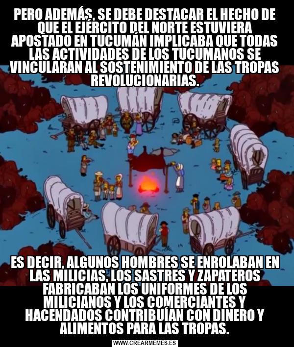 PERO ADEMÁS, SE DEBE DESTACAR EL HECHO DE QUE EL EJÉRCITO DEL NORTE ESTUVIERA APOSTADO EN TUCUMÁN IMPLICABA QUE TODAS LAS ACTIVIDADES DE LOS TUCUMANOS SE VINCULARAN AL SOSTENIMIENTO DE LAS TROPAS REVOLUCIONARIAS. ES DECIR, ALGUNOS HOMBRES SE ENROLABAN EN LAS MILICIAS, LOS SASTRES Y ZAPATEROS FABRICABAN LOS UNIFORMES DE LOS MILICIANOS Y LOS COMERCIANTES Y HACENDADOS CONTRIBUÍAN CON DINERO Y ALIMENTOS PARA LAS TROPAS.