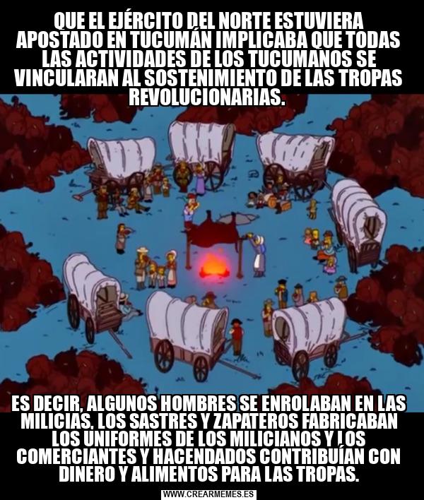 QUE EL EJÉRCITO DEL NORTE ESTUVIERA APOSTADO EN TUCUMÁN IMPLICABA QUE TODAS LAS ACTIVIDADES DE LOS TUCUMANOS SE VINCULARAN AL SOSTENIMIENTO DE LAS TROPAS REVOLUCIONARIAS. ES DECIR, ALGUNOS HOMBRES SE ENROLABAN EN LAS MILICIAS, LOS SASTRES Y ZAPATEROS FABRICABAN LOS UNIFORMES DE LOS MILICIANOS Y LOS COMERCIANTES Y HACENDADOS CONTRIBUÍAN CON DINERO Y ALIMENTOS PARA LAS TROPAS.