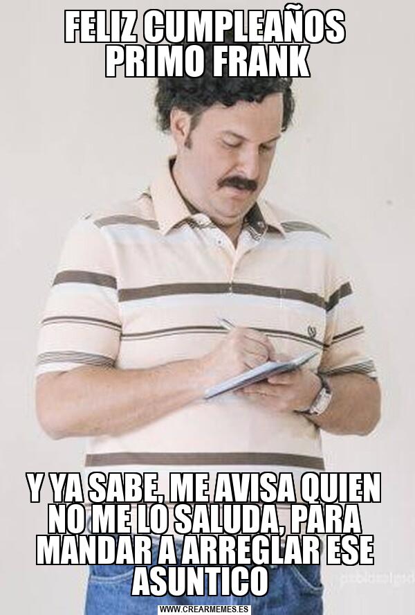 FELIZ CUMPLEAÑOS PRIMO FRANK Y YA SABE, ME AVISA QUIEN NO ME LO SALUDA, PARA MANDAR A ARREGLAR ESE ASUNTICO