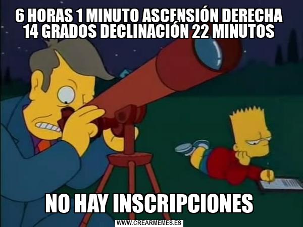 6 HORAS 1 MINUTO ASCENSIÓN DERECHA 14 GRADOS DECLINACIÓN 22 MINUTOS NO HAY INSCRIPCIONES
