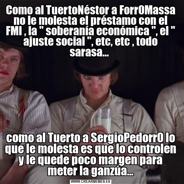 Como al TuertoNéstor a Forr0Massa no le molesta el préstamo con el FMI , la " soberanía económica ", el " ajuste social ", etc, etc , todo sarasa... como al Tuerto a SergioPedorr0 lo que le molesta es que lo controlen y le quede poco margen para meter la ganzúa...