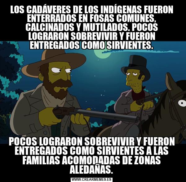 LOS CADÁVERES DE LOS INDÍGENAS FUERON ENTERRADOS EN FOSAS COMUNES, CALCINADOS Y MUTILADOS. POCOS LOGRARON SOBREVIVIR Y FUERON ENTREGADOS COMO SIRVIENTES. POCOS LOGRARON SOBREVIVIR Y FUERON ENTREGADOS COMO SIRVIENTES A LAS FAMILIAS ACOMODADAS DE ZONAS ALEDAÑAS.