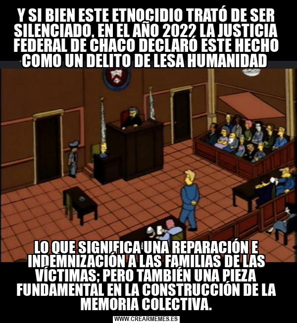 Y SI BIEN ESTE ETNOCIDIO TRATÓ DE SER SILENCIADO, EN EL AÑO 2022 LA JUSTICIA FEDERAL DE CHACO DECLARÓ ESTE HECHO COMO UN DELITO DE LESA HUMANIDAD LO QUE SIGNIFICA UNA REPARACIÓN E INDEMNIZACIÓN A LAS FAMILIAS DE LAS VÍCTIMAS; PERO TAMBIÉN UNA PIEZA FUNDAMENTAL EN LA CONSTRUCCIÓN DE LA MEMORIA COLECTIVA.
