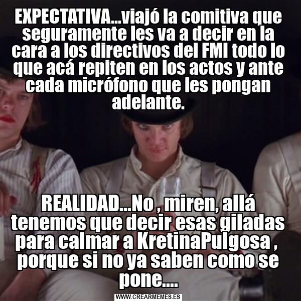 EXPECTATIVA...viajó la comitiva que seguramente les va a decir en la cara a los directivos del FMI todo lo que acá repiten en los actos y ante cada micrófono que les pongan adelante. REALIDAD...No , miren, allá tenemos que decir esas giladas para calmar a KretinaPulgosa , porque si no ya saben como se pone....