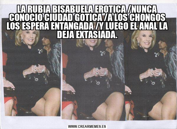 LA RUBIA BISABUELA EROTICA /NUNCA CONOCIO CIUDAD GOTICA /A LOS CHONGOS LOS ESPERA ENTANGADA /Y LUEGO EL ANAL LA DEJA EXTASIADA.