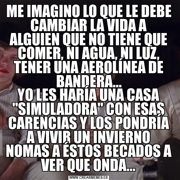 ME IMAGINO LO QUE LE DEBE CAMBIAR LA VIDA A ALGUIEN QUE NO TIENE QUE COMER, NI AGUA, NI LUZ, TENER UNA AEROLÍNEA DE BANDERA... YO LES HARÍA UNA CASA "SIMULADORA" CON ESAS CARENCIAS Y LOS PONDRÍA A VIVIR UN INVIERNO NOMAS A ÉSTOS BECADOS A VER QUE ONDA...