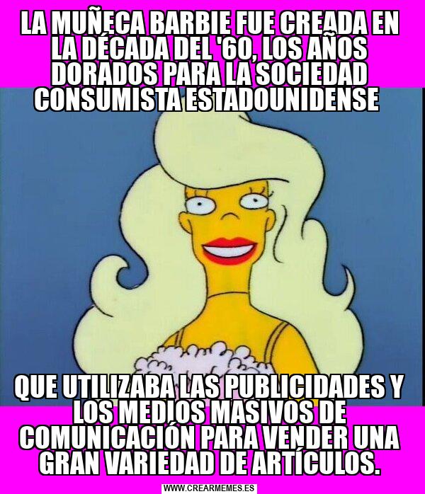 LA MUÑECA BARBIE FUE CREADA EN LA DÉCADA DEL '60, LOS AÑOS DORADOS PARA LA SOCIEDAD CONSUMISTA ESTADOUNIDENSE QUE UTILIZABA LAS PUBLICIDADES Y LOS MEDIOS MASIVOS DE COMUNICACIÓN PARA VENDER UNA GRAN VARIEDAD DE ARTÍCULOS.