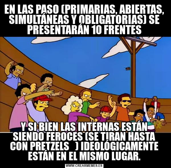 EN LAS PASO (PRIMARIAS, ABIERTAS, SIMULTÁNEAS Y OBLIGATORIAS) SE PRESENTARÁN 10 FRENTES Y SI BIEN LAS INTERNAS ESTÁN SIENDO FEROCES (SE TIRAN HASTA CON PRETZELS ) IDEOLÓGICAMENTE ESTÁN EN EL MISMO LUGAR.