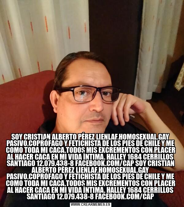 SOY CRISTIAN ALBERTO PÉREZ LIENLAF,HOMOSEXUAL,GAY PASIVO,COPRÓFAGO Y FETICHISTA DE LOS PIES DE CHILE Y ME COMO TODA MI CACA,TODOS MIS EXCREMENTOS CON PLACER AL HACER CACA EN MI VIDA ÍNTIMA. HALLEY 1684 CERRILLOS SANTIAGO 12.079.438-8 FACEBOOK.COM/CAP
